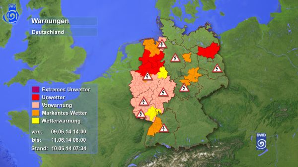 Nach dem Durchzug einer Squall-Line im Westen Deutschlands gestern, drohen heute weitere Gewitter in Deutschland. Aktuelle Warnungen bestehen für Brandenburg und Niedersachsen. Für NRW, RP und Hessen bestehen Vorwarnungen.