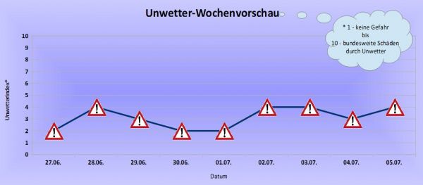Die nächste Woche wird unwettermäßig wohl nicht besonders gefährlich ausfallen. Jedoch besteht zumindest tageweise auch ein mäßiges Gewitterrisiko. Bei recht wechselhafter, d.h. zeitweise auch freundlicher Witterung besteht sonst zum weitaus größten Teil nur ein leichtes Unwetterrisiko.