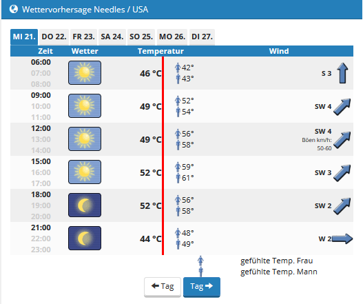 Eine kleine Kostprobe (Tageshöchsttemperaturen am Mittwoch): Carlin (Nevada) kommt auf 38 °C, Redding (Kalifornien) und Las Vegas (Nevada) beide auf 46 °C.