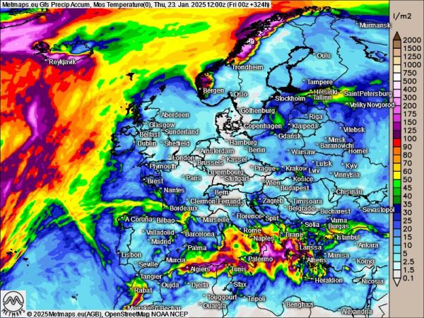 Aufsummierte Niederschlagsmengen Europa bis 23.01.2025