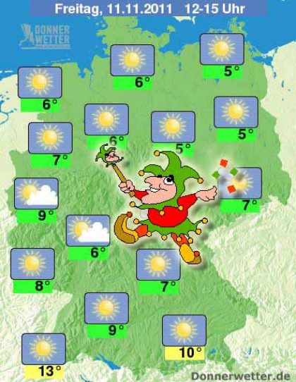 Die Karnevals- und Faschingssession 2011/2012 beginnt wie die letzte Session endete: Am Rosenmontag 2011 herrschte bestes, sonniges Wetter in den Hochburgen. Und auch zum Auftakt am 11.11.2011 ist es zwar oft frisch, aber nach Nebel- und Hochnebelauflösung meist richtig sonnig: