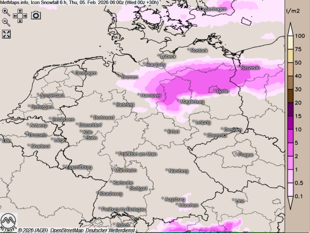In der kommenden Nacht zum Donnerstag greifen von Osten und der Mitte nordwärts Schneefälle über; gebietsweise fällt auch Regen, der lokal auf eiskalte Böden treffen und gefrieren kann.