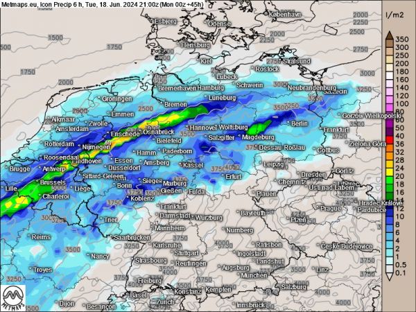 Die Karte zeigt die 6-Stunden-Niederschlagssummen bis Dienstag (21:00 Uhr) nach aktuellem ICON-Modelllauf: