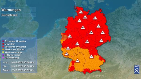 Besonders der Nord- und Osthälfte drohen in der Nacht auf Samstag verbreitet Böen um 100 bis 120 km/h (Windstärke 10 bis 12). Auch südlich der Mittelgebirge muss sich auf Sturmböen eingestellt werden, hier kommt man aber vergleichsweise glimpflich davon. Auch am Samstag und Sonntag stehen immer wieder Sturmböen auf dem Programm.