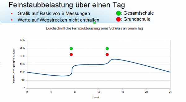 Wir haben über ein Schuljahr lang den Feinstaubgehalt an zwei Schulwegen in der Luft gemessen. Das Ergebnis in der Kurzfassung: Schüler atmen auf einem 10-15 Minuten dauernden Schulweg deutlich mehr Feinstaub ein als es uns amtliche Messungen weismachen wollen. Diese werden, und das dürfte einer der Hauptgründe für die viel zu guten Werte von offizieller Seite sein, in 300 cm Höhe gemessen. Also dort, wo weder Kinder noch Menschen allgemein Luft einatmen.