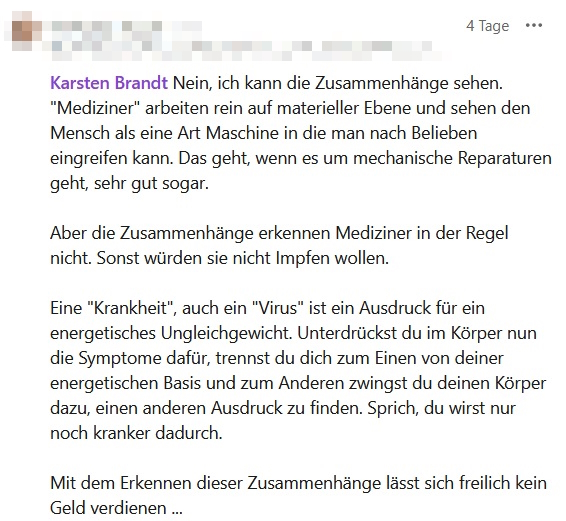 Dabei stellt sich gar nicht die die Frage, ob es während und auch nach der Pandemie Fehler und Versäumnisse gab. Die gab es zu genüge; mal mit mehr, mal mit minder schweren Folgen für den oder die Einzelne. Doch gibt einem das das Recht, seine Weltanschauung ungefragt und mit aller Vehemenz durchsetzen zu wollen? Und Andersdenkende als dumm und naiv darstellen zu wollen, obwohl man überhaupt keine Qualifikation besitzt, eine solche Wertung vorzunehmen?
