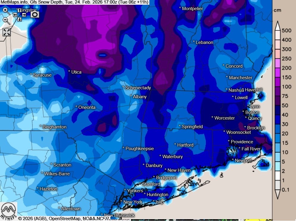 Die Schneehöhen und Temperaturen (Dienstag, 17:00 Uhr) nach GFS: