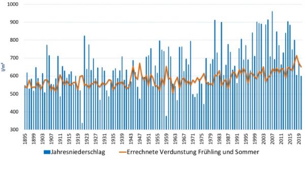 Die folgende Grafik zeigt den Jahresniederschlag und die errechnete Verdunstung im Frühling im Sommer im Zeitraum 1895 bis 2019 - exemplarisch für das Rheinland. Auffällig sind die steigenden Verdunstungsraten, verursacht durch steigende Lufttemperaturen.