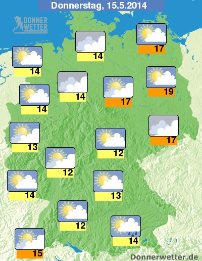 Leicht verhalten sind sie noch, die Temperaturmaxima am Donnerstag. Diese liegen nämlich bei ähnlichem Nivau oder sogar unter den Temperaturen der Vortage. Mit Werten um 17 bis 19 Grad ist es allein im Osten bereits milder, sonst Werte um 12 bis 14 Grad.