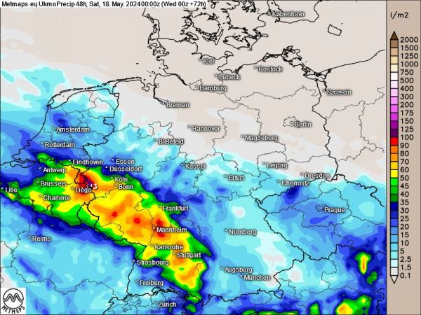 Das britische Wettermodell UKMO rechnet von heute bis Samstag lokal mit Niederschlagssummen von bis zu 130 l/m².