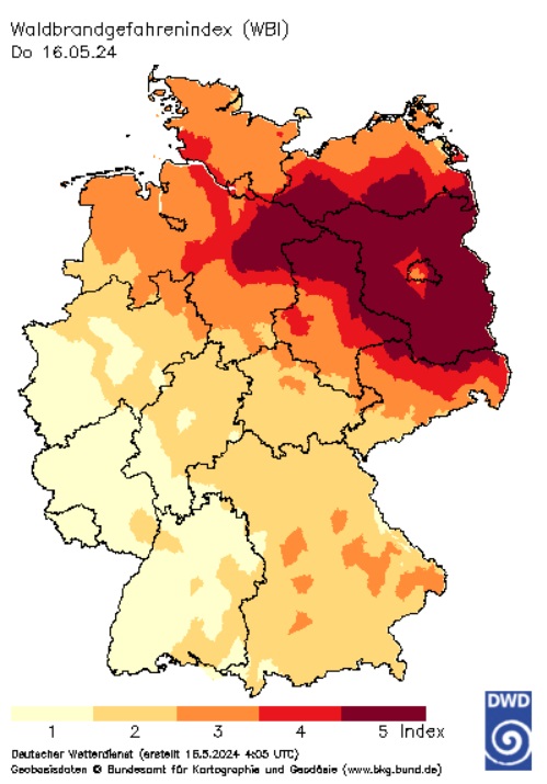 Mit erheblichen Auswirkungen auf das Wald- und Feldbrandrisiko: Bei teils sommerlichen Werten und einem lebhaften Wind erreicht der WBI (Waldbrandgefahrenindex) heute und morgen in weiten Teilen Brandenburgs, dem südlichen Mecklenburg-Vorpommern sowie in den östlichen Landesteilen Niedersachsens und Sachsen-Anhalts die höchste Warnstufe (5).