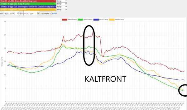 Rot eingezeichnet ist der Temperaturverlauf an unserer Station in Bonn, grün Burg Reuland, blau Hünningen-Holzwarche, gelb St. Vith (die letzten drei Ostbelgien). Am Ende Schwarz eingekreist: Tiefstwerte unter der 5-Grad-Marke am Sonntagmorgen