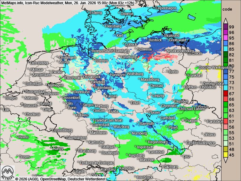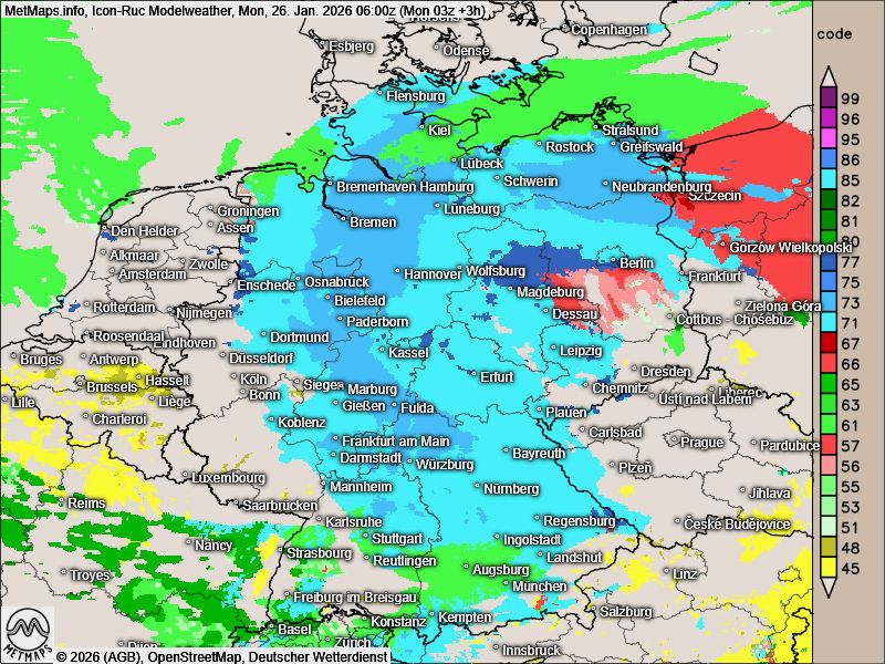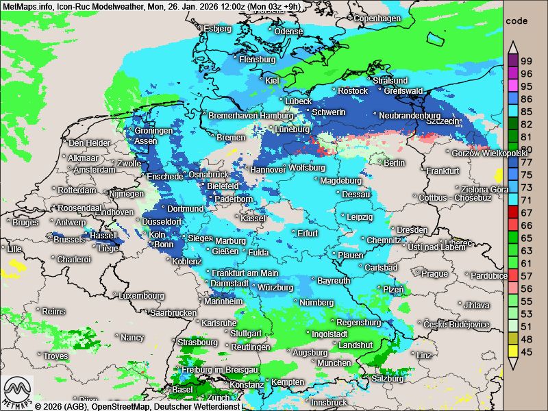 Im weiteren Tagesverlauf geht der Eisregen im Nordosten überwiegend in Schneefall über. Der Schwerpunkt verlagert sich dabei zunehmend auf teils kräftigen Schneefall.