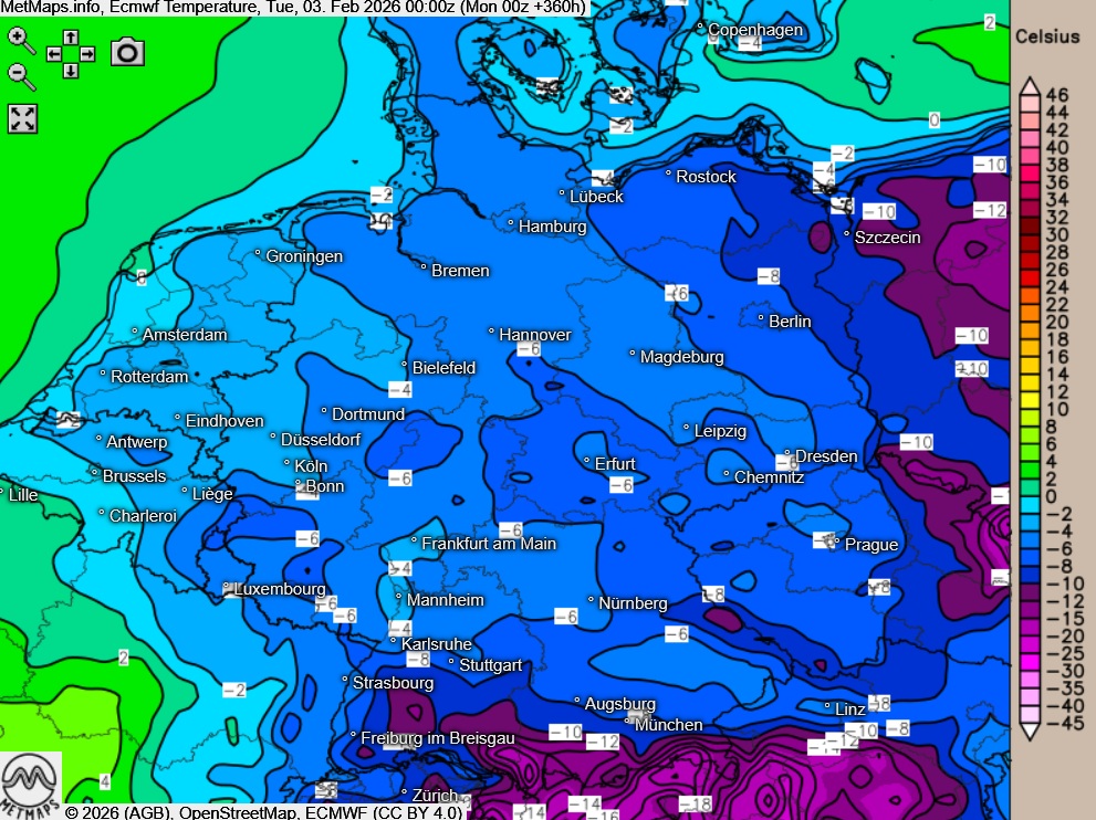 Die Temperaturen nach ECMWF und GFS für den 03.02.2026 (00:00 Uhr) mit lokal zweistelligen Minusgraden.