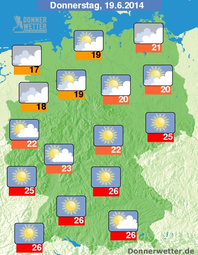An Fronleichnam ist es vor allem in der Nordhälfte wechselnd oder dicht bewölkt, im Süden, Osten und der Mitte Deutschlands zeigt sich häufig die Sonne. Regen ist nicht in Sicht, die Höchstwerte steigen im Tagesverlauf auf Werte um 17 Grad in Ostfriesland und um 26 Grad entlang der Alpen.