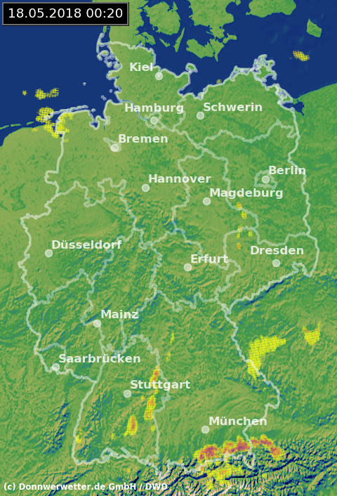 Heute muss ganz im Osten, sowie im Alpenvorland mit örtlichen Schauern und einzelnen Gewittern gerechnet werden. Die Niederschlagsmengen liegen dabei allgemein unter 10 Liter pro Quadratmeter. Sonst bleibt es überwiegend trocken.