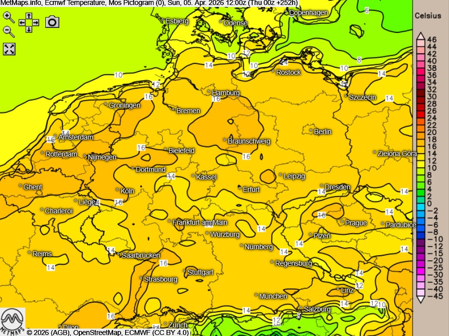 Besonders spannend: Am Ostermontag weit das Modell gebietsweise Temperaturen um 18 bis 20 Grad in den aktuellen Prognosen aus; lokal könnte es sogar noch etwas wärmer werden.