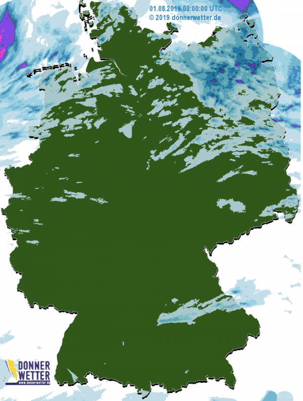 Das Radarbild zeigt aktuell einige punktuelle Schauersignale, die langsam von Westen nach Osten wandern. In Emden fielen dabei beispielsweise zwischen 22.00 Uhr und 23.00 Uhr 7,8 Liter Niederschlag pro Quadratmeter. In den Südwesten ziehen von Frankreich und der Schweiz her schwache Signale hinein, die jedoch nicht auf Niederschlag deuten. Sonst präsentiert sich der Himmel über Deutschland teils wolkenverhangen, teils sternenklar.