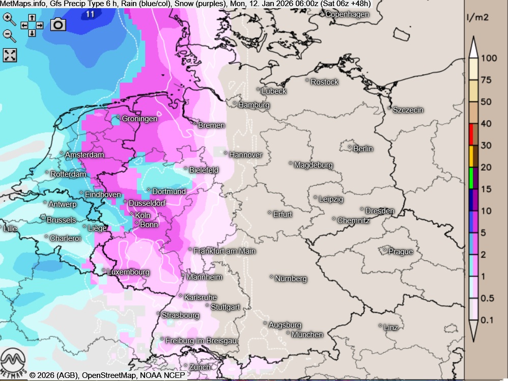 In der Nacht auf Montag breiten sich von der Nordseeküste bis in den Schwarzwald Schneefälle aus, stellenweise fällt auch gefrierender Regen. Dadurch können Straßen, Gehwege und andere Flächen verbreitet mit gefährlichen Eispanzern überzogen werden.