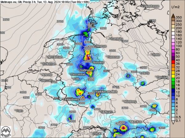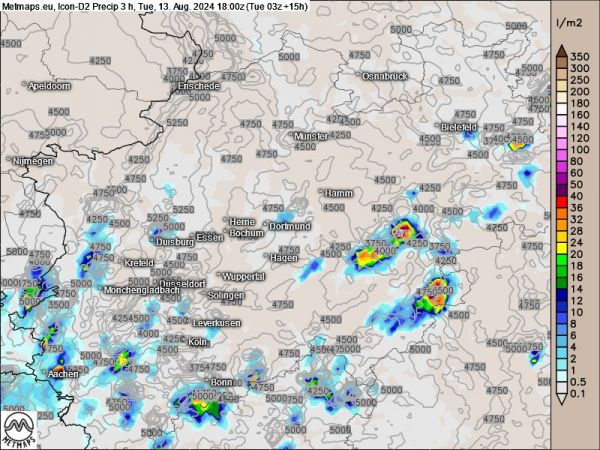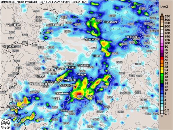 Das deutsche Modell Icon D2 sowie die französische Arome-Modellvorhersage sehen die Gewitterschwerpunkte weiter westlich. Bis 18 Uhr wären dann besonders Nordrhein-Westfalen, Rheinland-Pfalz und auch möglicherweise Teile Hessens von einzelnen Gewitterzellen mit größeren Regenmengen betroffen.