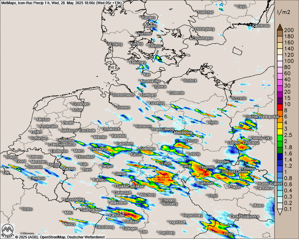 Die aktuellen Modellrechnungen nach ICON mit den stündlichen Niederschlagssummen bis 16:00 bzw. 18:00 Uhr:
