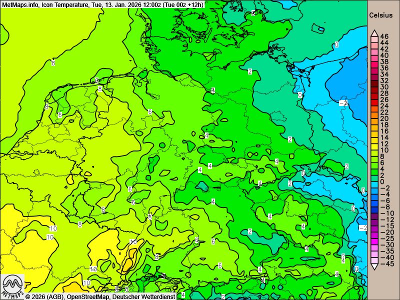 Bis zum Mittag steigen auch im Nordosten die Temperaturen in den Plusbereich, die mildere Luft kommt also im gesamten Bundesgebiet an - Glätte ist dann vorerst kein Thema mehr. Am Rhein werden am Dienstag sogar stellenweise Höchstwerte um 10 Grad erreicht.
