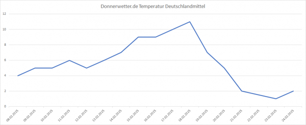 Die Grafik zeigt die modellberechnete Mitteltemperatur für Deutschland für den Zeitraum 08.02. bis 24.02.2025.