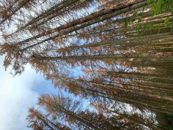 An vielen Stellen der Wälder stehen nun Gerippe. Baumleichen mit toten Nadelbäumen, wie hier in der Mitte des Bildes aufgenommen vor kargen Feldern. Unten sind Baumleichen im Westerwald zu sehen, aufgenommen am Wochenende. Was der saure Regen nicht geschafft hat, schafft jetzt der Klimawandel.