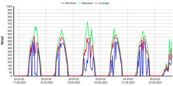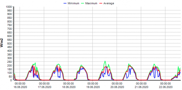 Wir haben mithilfe eines Strahlungsmessgerätes die reflektierte Globalstrahlung auf zwei verschiedenen Untergründen gemessen und interessante Ergebnisse bekommen. Wie man auf den Diagrammen unten erkennen kann, reflektiert die Fläche mit Gras (oberes Diagramm) fast dreimal so viel Globalstrahlung wie eine schwarze Platte (unteres Diagramm).