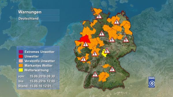 Die Karte zeigt die aktuelle Warnlage (Stand 12:20 Uhr) für Deutschland: