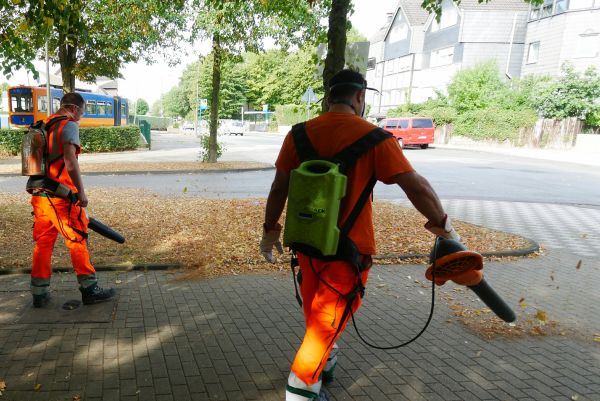Nein, wir haben uns bei diesem Bild nicht in der Jahreszeit geirrt. Das Foto, aufgenommen gestern von Achim Otto, zeigt zwei Stadtmitarbeiter bei der Beseitigung von Laub.