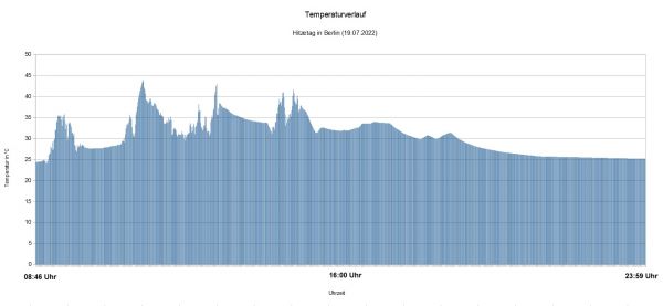 donnerwetter.de-Meteorologe Karsten Brandt war gestern den ganzen Tag in Berlin unterwegs und hat den gesamten Hitzetag mit einem Thermometer "eingefangen", welches im Dauerbetrieb aufzeichnete: