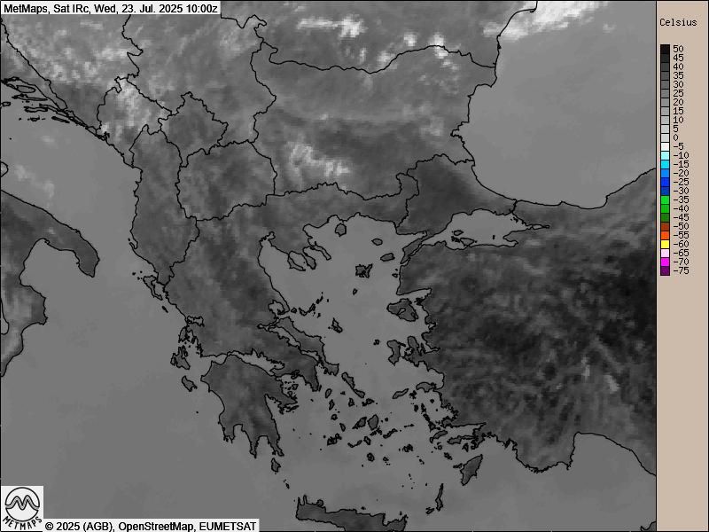 Wie auf dem Satelliten-Infrarotbild erkennbar ist, lagen die Wassertemperaturen heute um die Mittagszeit bei 28 Grad, auf den Oberflächen beliefen sich die Temperaturen auf Werte um 50 Grad. In Teilen der Türkei und Griechenlands sind bis zum Wochenende Lufttemperaturen um 43 Grad zu erwarten.