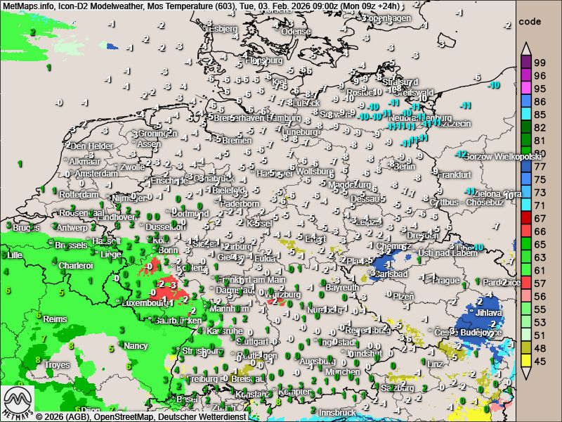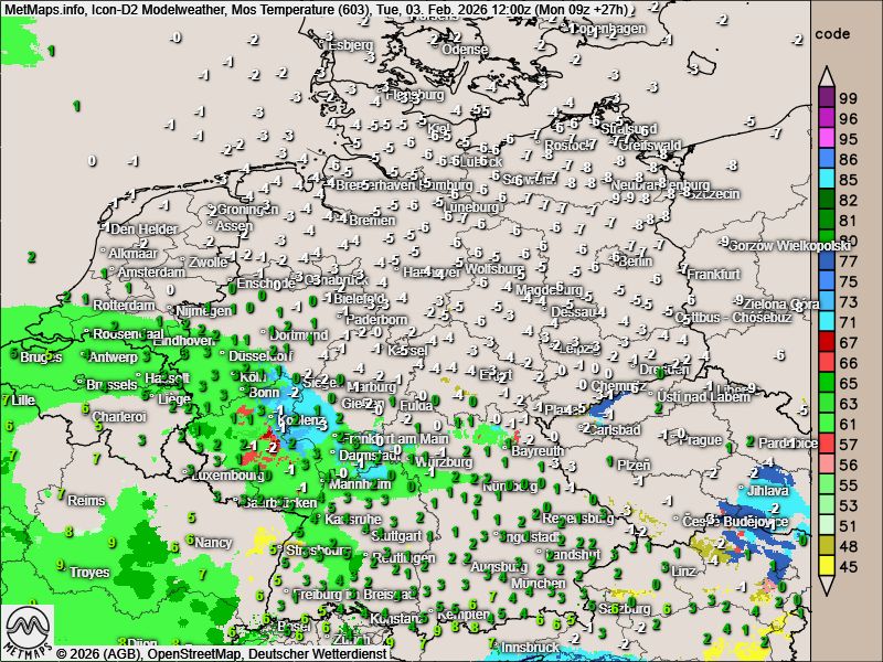 Nach den aktuellen ICON-Modellberechnungen setzt der Eisregen am Vormittag zunächst in Rheinland-Pfalz ein. Im weiteren Verlauf weiten sich die gefrierenden Niederschläge auf Hessen aus, bis zum Abend erreichen sie auch Thüringen und Niedersachsen, wo dann auch zunehmend mit Schneefall zu rechnen ist.