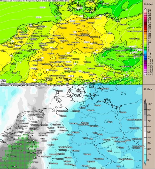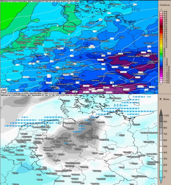 Die beiden folgenden Karten zeigen die Lufttemperaturen und das allgemeine Wetter für den 23.02.2025 (12:00 Uhr) nach ECMWF
