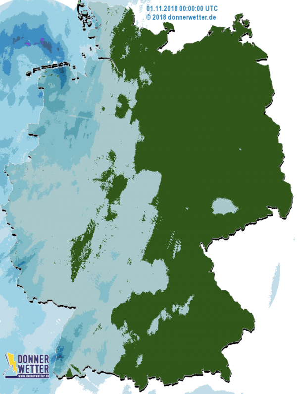 Heute fällt im Nordwesten gelegentlich etwas Regen oder es gehen örtliche Schauer nieder, im Tagesverlauf wahrscheinlich auch über den Mittelgebirgen und im Osten. Im Chiemgau kann es im Laufe des Nachmittags von Österreich her ebenfalls zu Regen kommen. Die Niederschlagsmengen liegen allgemein aber unter 7 Liter pro Quadratmeter. Im großen Rest bleibt es in der Regel trocken.