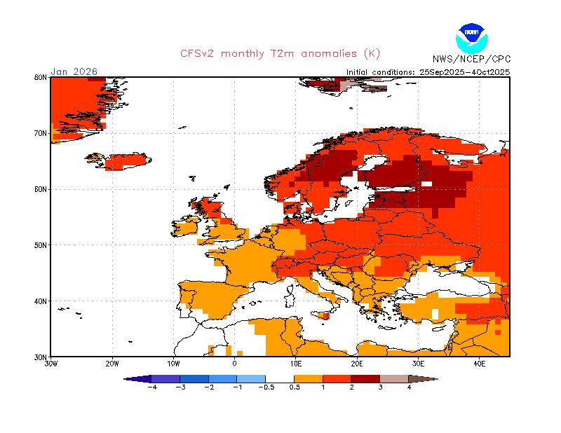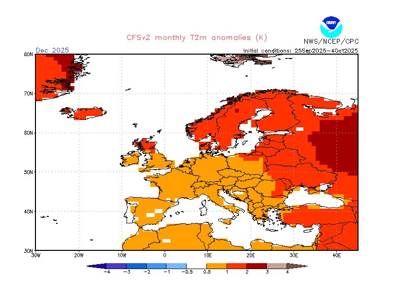 Nachfolgend die NOAA-Prognosen nach dem CFS Modell für Dezember und Januar mit wahrscheinlich längeren winterlichen Phasen.