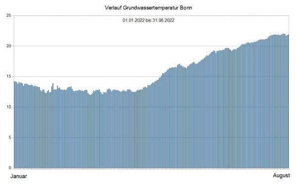 Nicht jedoch die Grundwassertemperaturen, die in diesem Sommer auch auf sehr hohem, zum Teil historischen Niveau lagen: An unserer Messstation in Bonn erheben wir seit etwa 15 Jahren täglich die Grundwassertemperatur - und noch nie vor 2022 verzeichneten wir in dieser Messreihe eine Temperatur >=22 Grad.