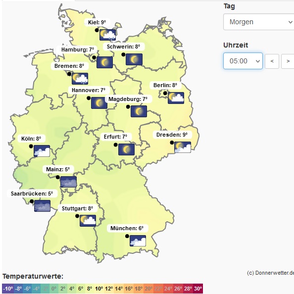Bewegen sich die Lufttemperaturen in weiten Regionen des Landes bei nächtlichen Tiefstwerten um 9 bis 6 Grad, in den Städten ist es noch etwas wärmer, meist oberhalb des Bodenfrostbereichs, wird es in den Mittelgebirgen deutlich frischer.