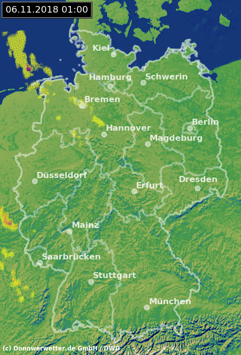 Das Radarbild zeigt aktuell zwar einige schwache Signale, diese deuten jedoch nicht auf Niederschlag. Sonst präsentiert sich der Himmel über Deutschlands teils bewölkt, teils sternenklar. Regional haben sich Nebelfelder gebildet.