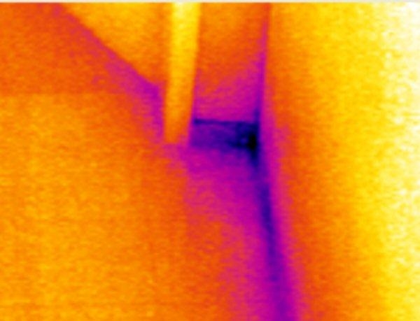 Auf unserem Infrarotbild oben sind die kalten Stellen an den Kellerritzen zur Außenwand in den Blautönen zu sehen.