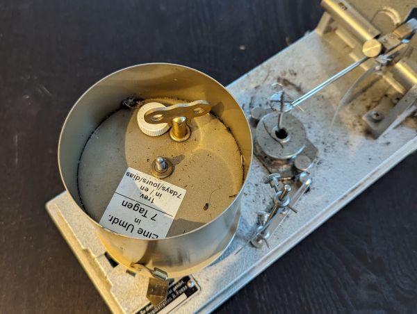Wird das mechanische Federwerk, was ein wenig dem einer Spieluhr gleicht, vollständig aufgezogen, dreht sich eine mit eine mit einem Schreibstreifen bestückte Messingtrommel genau sieben Tage lang und wird dabei von einem Faserschreiber beschrieben.