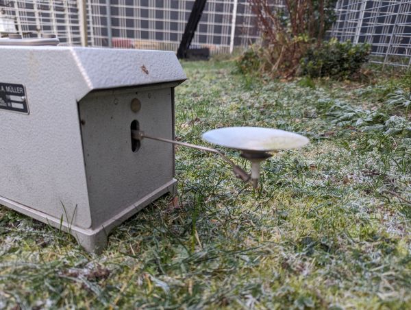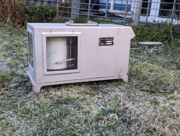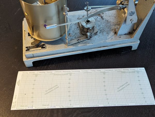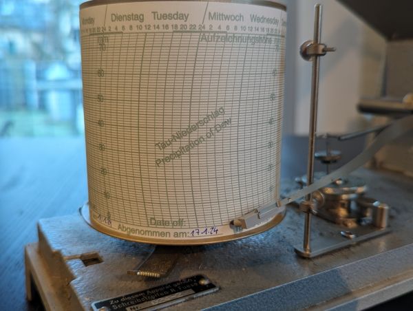 Nach einer kurzen Pause über den Jahreswechsel ging am heutigen Morgen unser Tau- und Reifschreiber nach Kessler wieder in Betrieb - ein Messgerät, welches auf sämtliche Elektronik verzichtet und von einem mechanischen Federwerk angetrieben wird. Selbst bei den aktuell sehr niedriegen Temperaturen arbeiten mechanische Schreiber wie dieser sehr zuverlässig und sind äußerst langlebig.