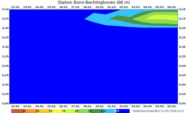 Die Grafik zeigt das Bodenfeuchteprofil an unserer Wetterstation in Bonn. Gut zu sehen: Während die obersten Bodenschichten zum Teil nur noch zu 70 Prozent wassergesättigt sind, besteht in den darunter liegenden, voll gesättigten Schichten derzeit kein Anlass zur Sorge.