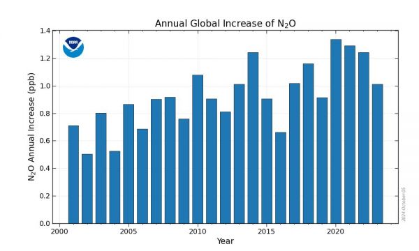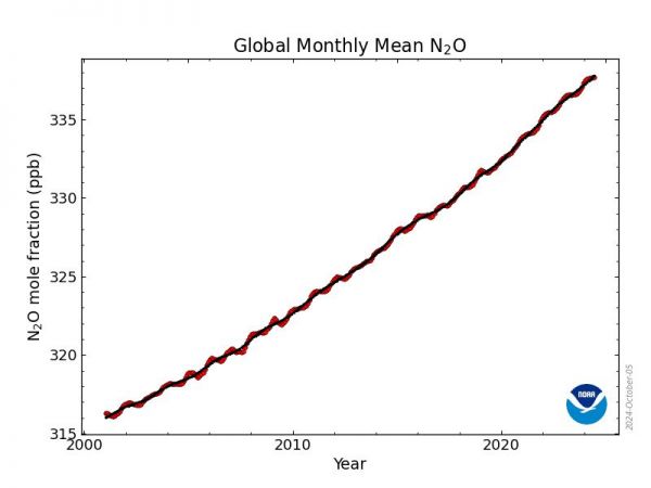 Die Grafiken zeigen die N2O-Messungen der NOAA seit dem Jahr 2000. Immerhin scheinen sich seit einigen Jahren die Anstiege nicht mehr zu beschleunigen - eine kleine gute Nachricht.