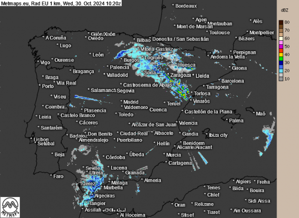 Das Radarbild von Spanien heute (30.10.2024, 10:20 Uhr):
