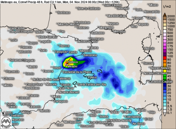 Für die Region um Vinaròs, etwa 160 Kilometer nördlich von Valencia liegend, fallen laut aktueller Modellläufe zwischen Samstag und Montag nochmals 80 bis 90 l/m² Niederschlag.
