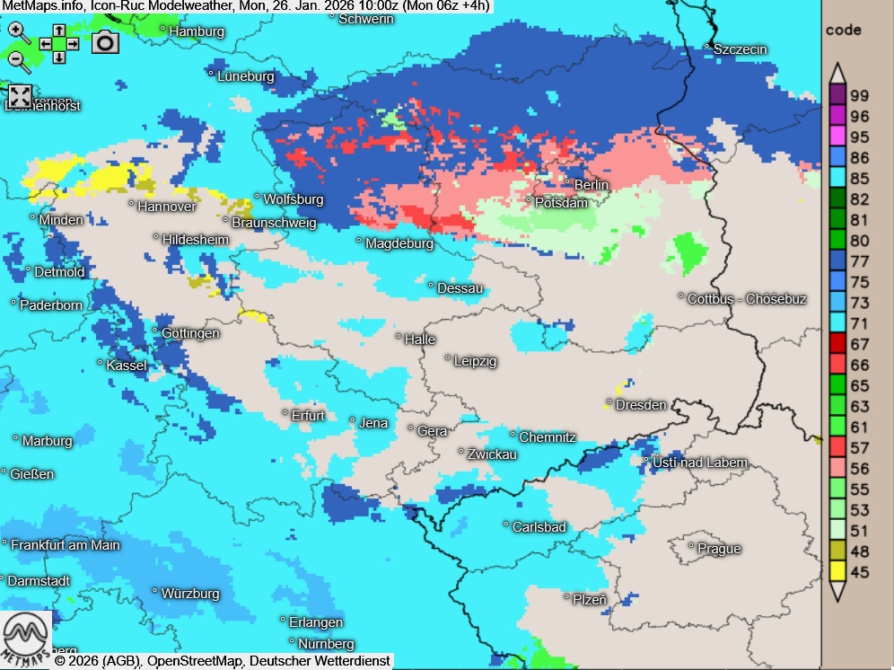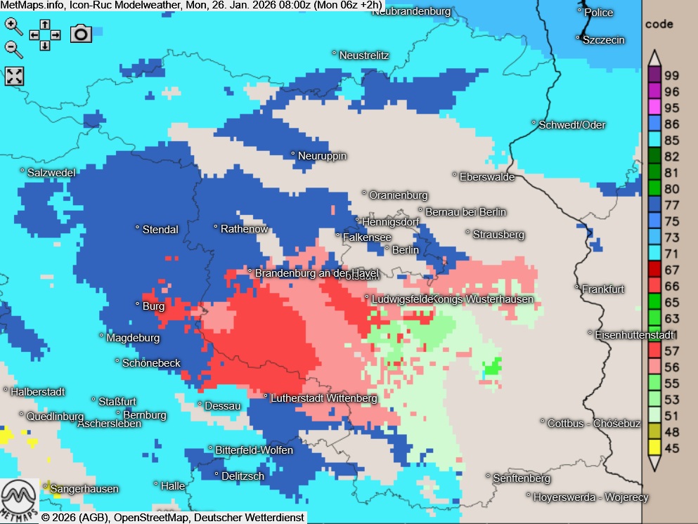 Vor allem in Teilen Brandenburgs und Sachsen-Anhalts sowie in Berlin fällt auch in den Vormittagsstunden noch gebietsweise gefrierender Regen; bei Lufttemperaturen meist um den Gefrierpunkt besteht weiterhin erhebliche Glättegefahr.