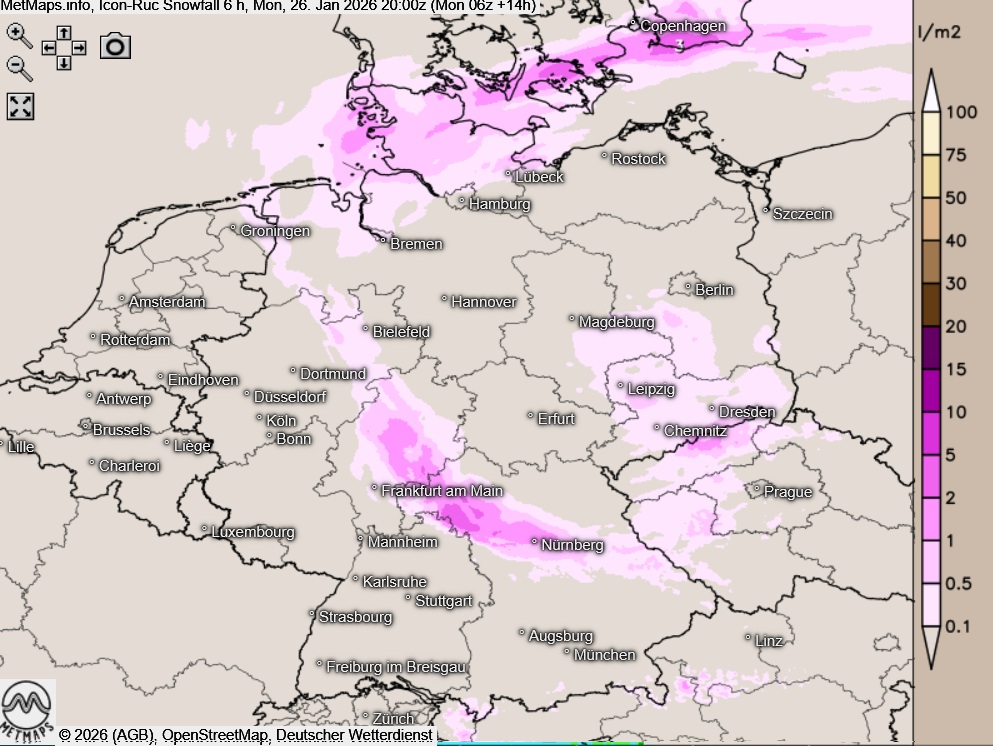 Von Norddeutschland bis in die Osthälfte NRWs sowie von Hessen über Baden-Württemberg bis in den Norden und Osten Bayerns liegt der Fokus am Montag vor allem auf den teils ergiebigen Schneefällen. In den genannten Gebieten kommen bis zum Abend mehrere Zentimeter Neuschnee zusammen,