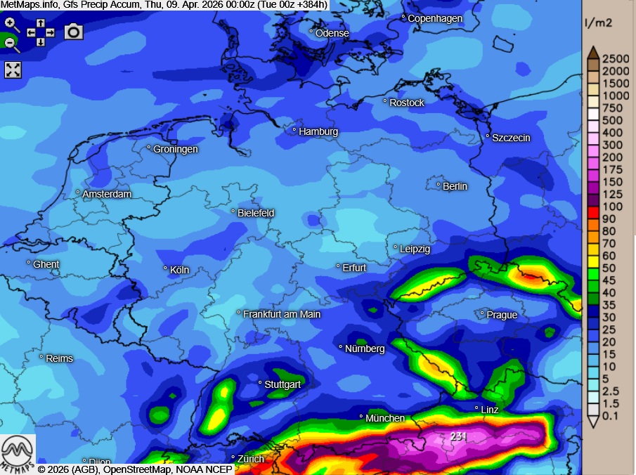 Akkumulierte Regenmengen nach GFS bis 09.04.2026